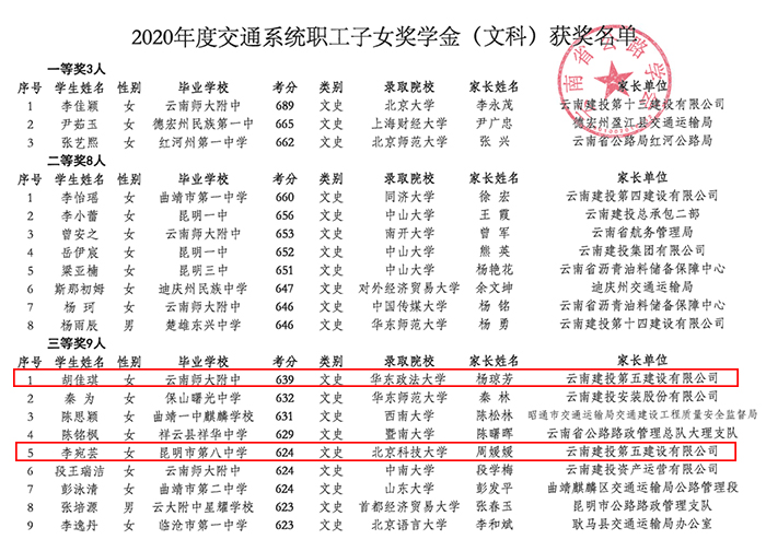 9月11日,2020年度云南省公路學會職工子女考入重點院校獎學金評審結果發(fā)布,公司申報的兩名職工子女分均獲得文科類三等獎,獲得獎學金1200元。