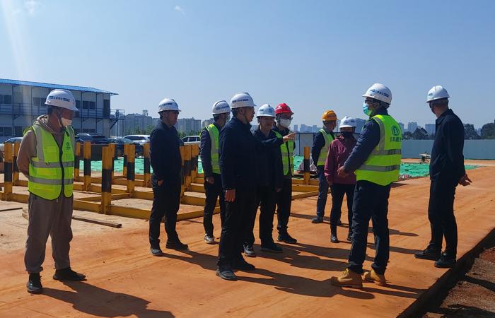 付雋蒼一行深入項(xiàng)目施工現(xiàn)場(chǎng)實(shí)地調(diào)研,了解項(xiàng)目施工動(dòng)態(tài),聽取了直管部負(fù)責(zé)人及項(xiàng)目經(jīng)理對(duì)項(xiàng)目整體建設(shè)、生產(chǎn)進(jìn)度、安全、質(zhì)量管控等情況的詳細(xì)匯報(bào),實(shí)地考察了項(xiàng)目推進(jìn)情況。