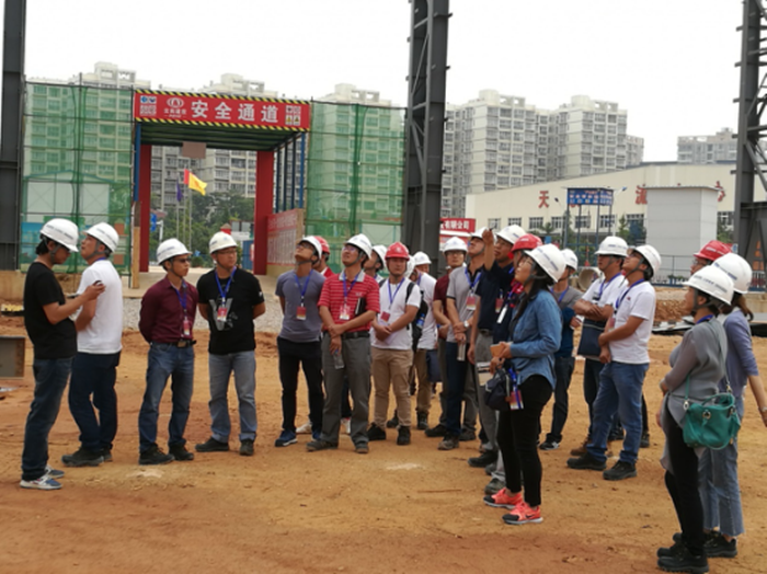 項目管理人員用PPT給講解了此項目的具體情況和鋼結(jié)構(gòu)的整個施工流程,從項目概況,到鉆孔灌注樁、杯型基礎(chǔ)、重型鋼結(jié)構(gòu)吊裝,再到大型橋式起重機(jī)的使用、電磁屏蔽、最后到澆筑大面積混凝土地坪,為參觀者提供了對鋼結(jié)構(gòu)施工的整體概念,并在隨后的觀摩中,走進(jìn)鋼結(jié)構(gòu)施工現(xiàn)場,了解鋼結(jié)構(gòu)的細(xì)部拼裝和工藝流程。參觀完畢后,大家就參觀過程中存在的疑問與現(xiàn)場鋼結(jié)構(gòu)的管理人員進(jìn)行了交流。