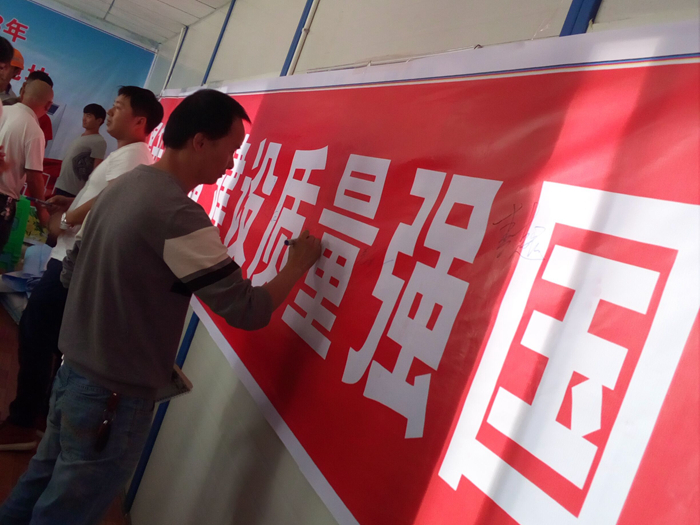 昭通市昭陽區(qū)2013年保障性住房建設項目2-B地塊標段經(jīng)理在會上作動員講話,施工勞務班組代表在會上進行宣誓,活動最后全體參會人員在布標上簽字承諾。