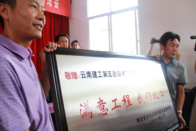 正是懷著這樣崇高的使命感和責(zé)任感,他們一步一個腳印地走到了最后,楚雄州州委、州政府為他們送上一面錦旗,說他們“為國分憂為民解愁”。楚雄州姚安縣委、縣政府為他們獻(xiàn)上一塊牌匾——建筑“鐵軍”,放心工程。官屯村的村民們?yōu)樗麄儷I(xiàn)上一塊牌匾——滿意工程,我們放心?;蛘呔褪且驗樗麄冏杂X地把百姓利益與國企責(zé)任聯(lián)系在了一起,才贏得了來自社會各界那么多的肯定,而這也恰恰成了他們在這個七•一為我們的黨獻(xiàn)上的,最美好的禮物!