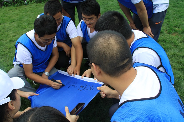 拓展開始通過報數(shù)的方式將成員分成了4個組,15分鐘的時間選出每個隊的隊長、隊長助理、隊名、口號、隊旗、和隊形,并在其他組面前展示。經(jīng)過各個小組的一番頭腦風(fēng)暴,一個個響亮的隊名和富有象征意義的隊旗逐一精彩亮相。