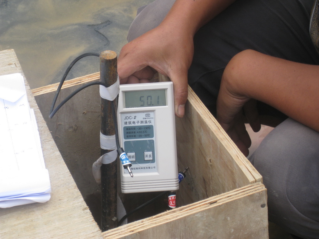 根據(jù)我公司大體積混凝土施工的成功經(jīng)驗,在澆灌混凝土之前編制了基礎大體積混凝土施工方案,采取優(yōu)化配合比設計、設置澆筑分倉縫,合理確定澆灌順序,保證筏板不出現(xiàn)冷縫,采用蓄水保溫養(yǎng)護法,并根據(jù)規(guī)范要求布置了7個測溫點。