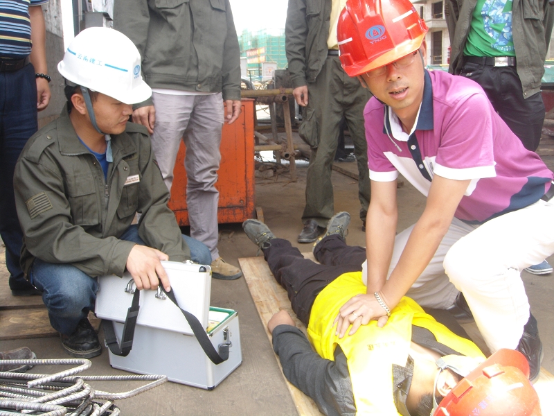 隨著現(xiàn)場一片寂靜,直五部潤城項目部2#鋼筋場正在施工的一名工人模擬觸電,旁邊的工友立即用木棍隔離觸電體后,切斷電源,馬上通知項目部經(jīng)理,項目經(jīng)理宣布啟動項目部應急預案,應急事故處理小組人員迅速趕赴現(xiàn)場……