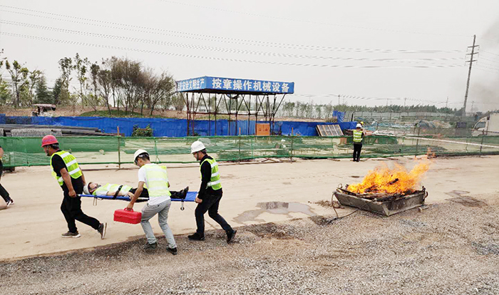 “安全生產月”啟動儀式結束后,全體人員在沁陽項目護城河施工現場開展消防安全應急演練,演練活動按照方案井然有序進行,119消防大隊消防員參與此次搶險滅火工作。
