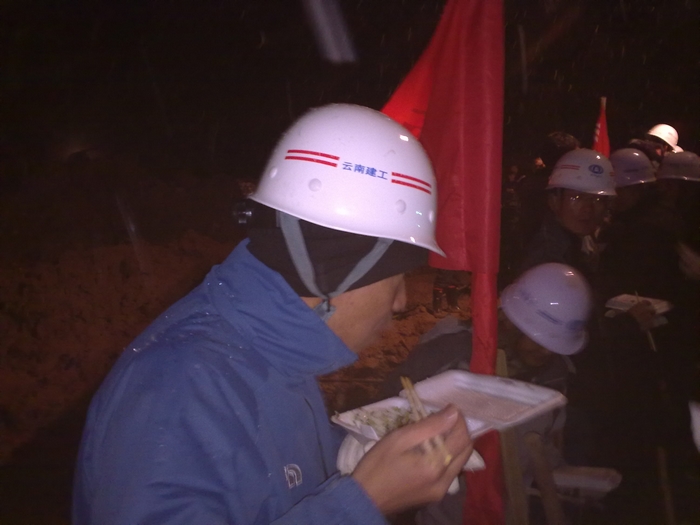 天色逐漸暗了下來,氣溫也逐漸在下降,雖然參加救援的人好幾個小時沒喝一口水、沒吃一點東西,但仍然沒人放棄。晚上十點,大家在奮戰(zhàn)了近十個小時后才匆匆忙忙吃了一盒盒飯。晚上十一點,項目部參加救援的人員在總指揮的安排下,一部分撤離了救援現(xiàn)場,項目部的趙登旭則留在了一線與救援人員繼續(xù)奮戰(zhàn),直至1月12日的中午。