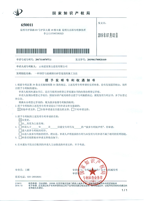 近日,公司《一種鋼管與水泥預(yù)制管連接的施工方法》與《一種鋼管與玻璃鋼夾砂管連接的施工方法》兩項(xiàng)技術(shù)成果榮獲國家發(fā)明專利授權(quán)。 兩個(gè)發(fā)明專利由路橋二部在公司技術(shù)中心等相關(guān)部門的指導(dǎo)下完成,項(xiàng)目部依托昆明市第十四污水處理廠自來水管道遷改工程,在管道遷改接點(diǎn)施工時(shí),發(fā)現(xiàn)遷改管道采用鋼管與水泥管、玻璃鋼夾砂管不同管材的管道連接,不同管材連接施工技術(shù)措施在國內(nèi)外尚不成熟,且施工操作比較困…