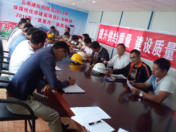2016年9月13日下午,昭通市昭陽區(qū)2013年保障性住房建設(shè)項(xiàng)目2—B地塊質(zhì)量月活動(dòng)啟動(dòng)儀式在項(xiàng)目現(xiàn)場(chǎng)舉行。公司五〇七直管項(xiàng)目部、第五直管項(xiàng)目部、第九直管項(xiàng)目部、第二安裝項(xiàng)目部的管理人員參加了啟動(dòng)儀式。 活動(dòng)宣傳了今年質(zhì)量月主題——“提升供給質(zhì)量,建設(shè)質(zhì)量強(qiáng)國”,闡述了施工質(zhì)量與施工安全、經(jīng)濟(jì)、工期的關(guān)系,強(qiáng)調(diào)了施工質(zhì)量...