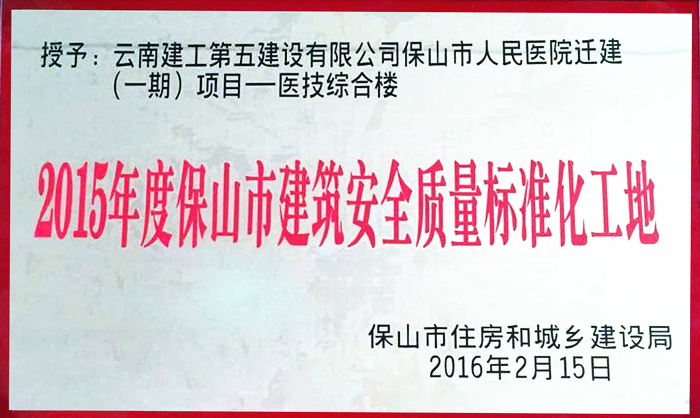 2016年3月,由公司承建第四直管項目部施工的保山市人民醫(yī)院遷建(一期)項目——醫(yī)技綜合樓及龍陵財富中心建設(shè)項目兩個工程均榮獲“2015年保山市建筑安全質(zhì)量標準化工地”。 保山市人民醫(yī)院遷建(一期)項目——醫(yī)技綜合樓,總建筑面積為41478平方米,包括新建五層框架結(jié)構(gòu)門急診綜合樓一幢,建筑面積為22789平方米(含全科醫(yī)生...