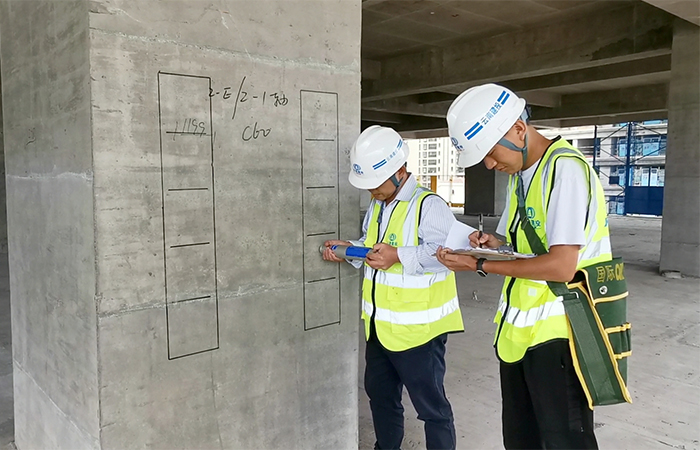 上午10點,項目部管理人員組成的實測實量小組在項目一標(biāo)段2棟6層集結(jié)完畢,分為四組進(jìn)行實測實量現(xiàn)場展示。第一小組使用回彈儀,檢測混凝土強(qiáng)度;第二小組使用2米工程檢測尺、工程塞尺對墻體垂直平整度進(jìn)行測量;第三小組一手推動外觀神似玩具車的鋼筋保護(hù)層檢測儀,一手拿著數(shù)據(jù)顯示儀監(jiān)測數(shù)據(jù),檢測地面、墻面鋼筋保護(hù)層厚度是否符合要求;項目技術(shù)負(fù)責(zé)人使用樓板厚度檢測儀檢測樓層板厚。
