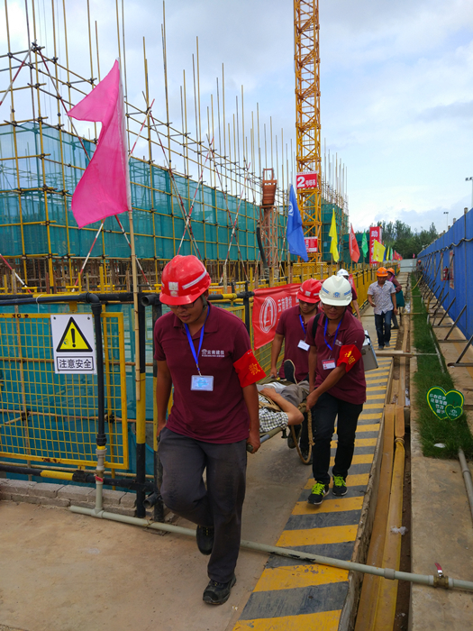 項(xiàng)目部應(yīng)急救援小組依據(jù)事故類型,假設(shè)施工人員意外從高處墜落的事故發(fā)生現(xiàn)場,根據(jù)應(yīng)急救援方案,進(jìn)行了流程內(nèi)容演練:管理人員在第一時(shí)間得知情況后即快速反應(yīng),救援組、疏導(dǎo)組、調(diào)查組、通訊組及后勤保障等人員各司其職迅速趕往現(xiàn)場,正確判斷險(xiǎn)情,救助現(xiàn)場“受傷工人”,同時(shí)拉起禁戒線、通知120急救人員。整個(gè)救援演練現(xiàn)場井然有序,各組人員行動(dòng)迅速及時(shí)。本次演練旨在,增強(qiáng)現(xiàn)場施工人員安全生產(chǎn)意識(shí),檢驗(yàn)安全預(yù)案的可操作性,提高一線管理人員處理安全事故的能力。