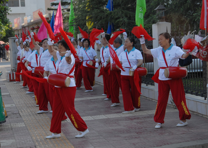 退休女工腰鼓隊激情獻(xiàn)藝。