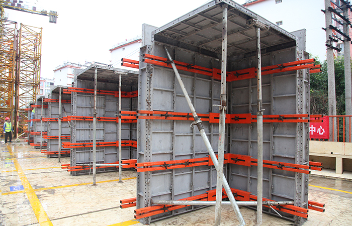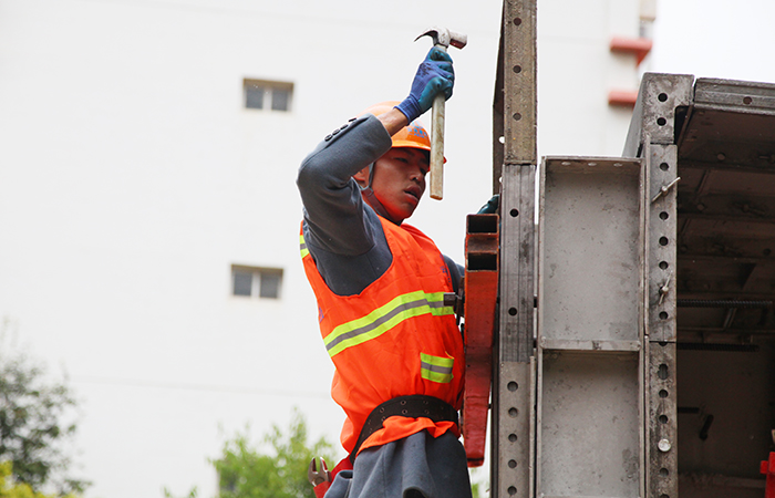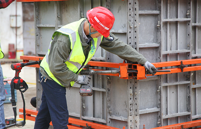 10點(diǎn)20分左右,天空雨水依然連綿,實(shí)操比賽正式開始,五組參賽選手同時(shí)在實(shí)操區(qū)域按照?qǐng)D紙安裝鋁模,現(xiàn)場撐模板、插螺桿、旋螺母的聲音相互摩擦,叮叮當(dāng)當(dāng)響個(gè)不停,瞬間掀起比賽的熱烈氛圍。有小組分工明確,操作熟練,進(jìn)度顯而易見,有小組注重細(xì)節(jié),安裝井然有序,模板牢固平穩(wěn)。在一小時(shí)的規(guī)定時(shí)間結(jié)束后,裁判人員對(duì)安裝完成的模板的質(zhì)量、指導(dǎo)安裝、文明施工等方面進(jìn)行綜合評(píng)分,對(duì)是否按配模圖紙進(jìn)行還原模板、模板垂直、平整度等進(jìn)行嚴(yán)格打分。隨后,所有參賽選手按要求拆除模板并堆碼材料回原位。