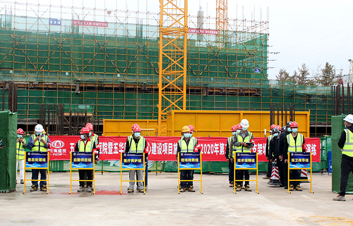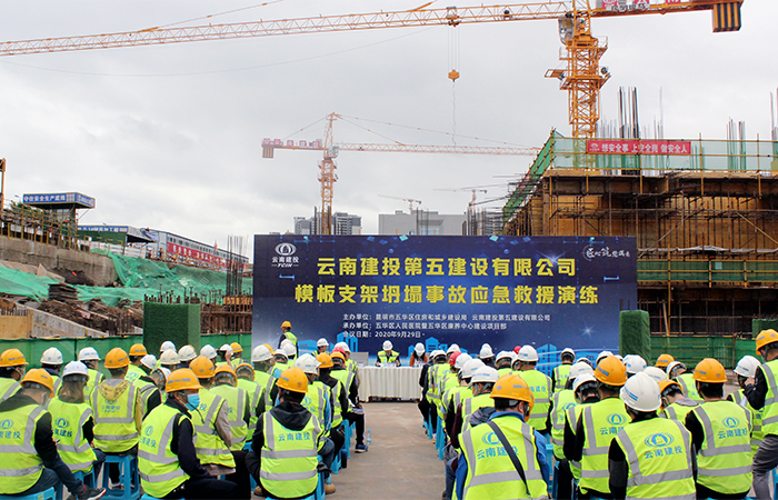 為了進(jìn)一步完善一線項(xiàng)目部的應(yīng)急機(jī)制,檢查應(yīng)對(duì)突發(fā)事件所需應(yīng)急隊(duì)伍、物資、裝備、技術(shù)等方面的準(zhǔn)備情況,檢驗(yàn)和完善應(yīng)急預(yù)案的實(shí)用性和可操作性,提高一線項(xiàng)目人員的應(yīng)急處置能力,公司于9月29日早上9時(shí)在五華醫(yī)院項(xiàng)目部組織開(kāi)展第三季度模板支架坍塌事故應(yīng)急演練。