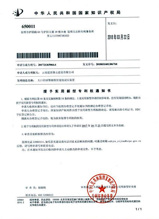 3月22日,第一安裝直管項(xiàng)目部在公司相關(guān)部門的指導(dǎo)下,榮獲國(guó)家實(shí)用新型專利《大口徑球墨鑄鐵管連續(xù)試壓裝置》。 在大理三庫(kù)連通項(xiàng)目的施工過(guò)程中,如何給1.2米的大口徑球墨鑄鐵管進(jìn)行試壓是第一安裝直管項(xiàng)目部面臨的一大考驗(yàn)。在聽(tīng)取了多個(gè)設(shè)計(jì)單位、生產(chǎn)單位的建議后,揉合以往的相關(guān)經(jīng)驗(yàn),直管部研發(fā)出一套滿足試驗(yàn)要求的“連續(xù)試壓裝置”。工程項(xiàng)目竣工之后,直管部積極總結(jié)施工經(jīng)驗(yàn),...